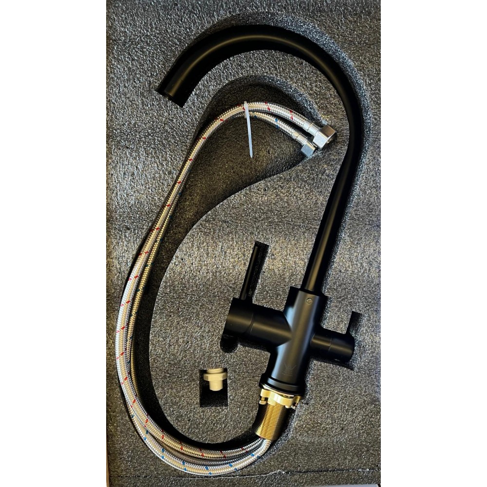 KITCHEN LAUNDRY GOOSENECK 3 WAY SINK MIXER TAP HOT & COLD PLUS DRINKING WATER OUTLET BLACK FREE POST